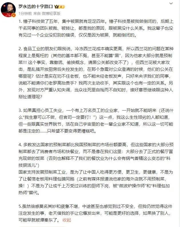 随后,11月26日,罗永浩再发文称:“西贝正在整改,这次跟西贝无关,这次是我和华杉之间的事。华杉这次再跟我私下道歉已经不管用了,必须公开道歉。今天下午六点之前,如果华杉没有在微博公开道歉,未来中国的市场公关行业应该不会有人再记得华与华了,只记得罗与华。顺便说一下,我已经在网上买了华与华的全集。整天被忽悠的中国土老板们,其实赚钱很不容易,也该有人给他们上一点营销防诈课了。”